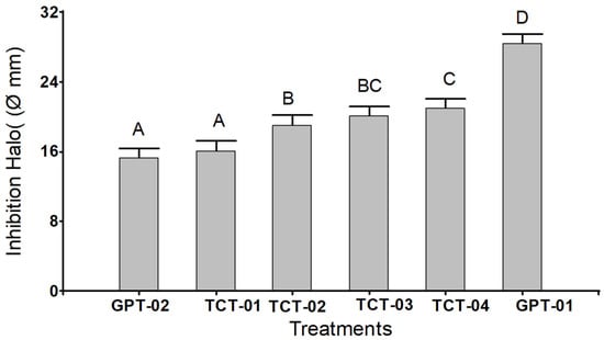 The analysis of variance showed highly significant differences (p < 0.0001); between at least two of the means of the treatments and the control groups; so, it was decided to apply Dunnett’s T3 multiple comparison test to find pairs of different means. This test found four significance ranges (A, B, C, and D), where the equal letters were not significantly different (p > 0.05) (Figure 1).