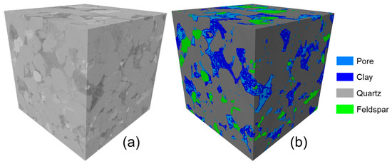 The sample was scanned using a nanoVoxel-2000 CT scanner (Sanying Precision Instruments, Tianjin, China) with a resolution of 3 μm. To construct a 3D multi-component digital rock, it is necessary to determine the mineral components in the CT images of the core. Different methods have been attempted for CT image segmentation. The conventional image processing procedure, which involves filtering and threshold segmentation, was initially used. In this study, we used the non-local means filter, which removed noise from the input CT image but preserves the sharpness of pore edges. The search window size was set to 8 voxels, and the spatial standard deviation in the Gaussian function was set to 5 to achieve a relatively good similarity weight. However, due to the presence of many micropores in the sample, filtering caused the loss of these pores, as shown in Figure 2b,c, where only the large pores were retained. Direct pore segmentation of the original CT images was another option. Threshold segmentation (Otsu’s thresholding method) and edge extraction (top-hat filter) were performed on the CT images to obtain the pore structure of the sample, as shown in Figure 2d. This method provided more accurate pore structure extraction results. For mineral segmentation, we attempted to incorporate the mineral composition results obtained from QEMSCAN into the digital rock model. However, due to the two-dimensional nature of the results obtained from QEMSCAN experiments and the overlapping grayscale values of different minerals in CT images, we had to conduct X-ray diffraction quantitative analysis experiments to obtain accurate primary clay mineral composition. It was conducted on the D2 PHASER XRD Analyzer (Bruker Corporation, Middlesex, MA, USA). The total clay content was 10.90%, with a content of 8.2% for kaolinite and 2.70% for illite. Additionally, the quartz content was 70.72% and the feldspar content was 7.08%. Therefore, we utilized the content values of these components as standards to perform segmentation on the CT images. The non-local means filtered and denoised image was directly segmented and divided into three parts: clay, quartz, and feldspar. As a result, a 3D multi-component digital core was constructed. Figure 3 shows the 3D grayscale image of rock with 500 × 500 × 500 voxels and the 3D multi-component digital rock.