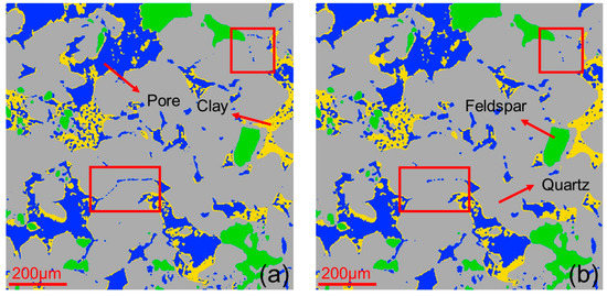 The rock properties were corrected for formation pressure based on the relationship between rock properties and pressure. Considering that the compressibility of the pore volume and clay structure under overburden pressure is more significant than that of the rock skeleton deformation, mathematical morphology operations were performed on clay minerals and pores to simulate the equivalent changes in rock structure under overburden conditions. The total volume of clay and pores was eroded to achieve volume compression under high pressure. In this study, we incrementally increased the erosion radius starting from 1 to 3 voxels. The pore was separately eroded to achieve compression of the pore volume under high pressure. The comparison of the 3D digital rock models before and after overburden correction is shown in Figure 5, which shows the compression of micropores and microcracks, as well as the compression and expansion of clay minerals, in accordance with the theoretical changes [16,17]. Porosity decreases as pressure increases. The volume ratio of different rock components before and after overburden correction is shown in Table 1. The lattice Boltzmann method was used to calculate the permeability before and after overburden correction. The variations in porosity and permeability obtained from numerical simulation are in good agreement with the results measured by the experiment (Table 1). Thus, the pressure correction of deep formations was achieved through the abovementioned methods.
