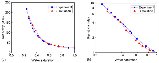 Comparison of laboratory experiments and numerical simulations for the selected sample. (a) The relationship between resistivity and water saturation, and (b) the relationship between resistivity index and water saturation.