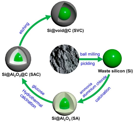 The preparation process of the yolk–shell Si@void@C composite was illustrated as Figure 1. Firstly, a certain amount of AlCl3 was weighted and dissolved into 10 mL of deionized water in a beaker. Then, 10 mL of ammonia and 0.4 g of pretreated Si powder were added into the solution. After magnetic stirring with ultrasonication for 2 h, the mixture was collected by centrifugal drying. The dried mixture was calcined at 700 °C for 2 h with a horizontal tube furnace in an Ar atmosphere. Samples with an AlCl3/Si weight ratio of 2:1, 1:1, and 1:2 were named as SA−21, SA−11, and SA−12, respectively.