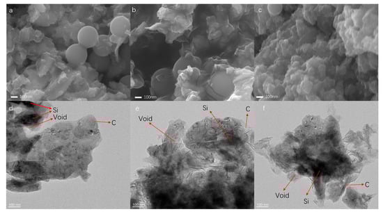 The electrochemical performance of Si@void@C samples was evaluated in half–cell configurations. Figure 9a–c illustrates the cyclic voltammetry (CV) results obtained at a scan rate of 0.1 mV s−1 across a voltage range of 0.01–1.1 V. The CV curves of all three samples are similar. In the first discharge, the broad reduction peak at around 0.7 V corresponds to the irreversible reaction between Li+ ions and Si surface functional groups, as well as the solid electrolyte mesophase, which disappeared in subsequent cycles [36]. The reduction peak at 0.20 V corresponds to the formation of LixSi, while the oxidation peaks at 0.31 V and 0.49 V arise from LixSi and Si de-alloying, respectively [37,38]. SEI was generated after the discharge process and charging process in the first cycle, and more silicon was involved in the intercalation/deintercalation of the lithium–ion process, resulting in a decrease of the discharge current in subsequent cycles. In subsequent cycles, the current values of the two oxidation peaks increase notably, attributed to the activation of additional Si atoms in the material. Most notably, the CV curves nearly overlap after the second cycle, demonstrating that the anode material exhibits high reversibility.