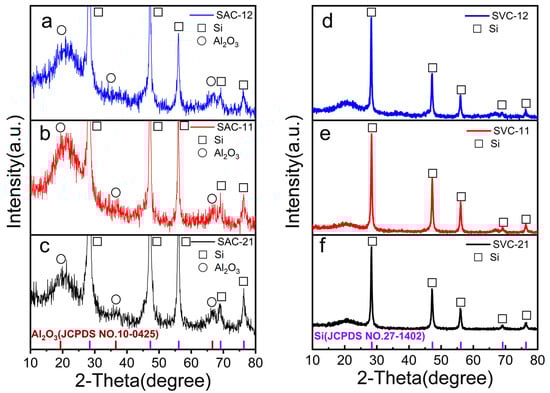 XRD of (a) SAC−12, (b) SAC−11, (c) SAC−21; (d) SVC−12, (e) SVC−11, and (f) SVC−21.