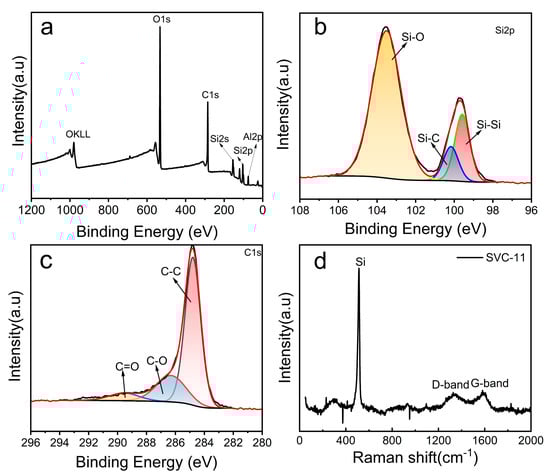XPS survey of SVC−11 (a); high resolution XPS spectra for (b) C 1s and (c) Si 2p; (d) Raman spectra of SVC−11.