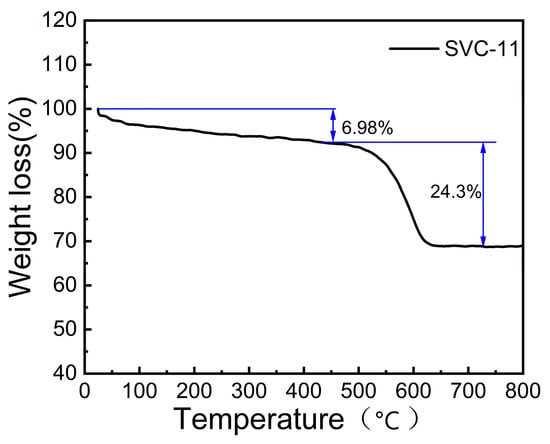 To further investigate and determine the content of fixed carbon in the SVC composite material, SVC−11 was subjected to TG testing, as shown in Figure 8. The test conditions consisted of heating the material in an air atmosphere from 25 °C to 800 °C at a rate of 10 °C/min. Figure 8 shows the thermogravimetric results of the material. It can be observed from the figure that the mass fraction of the SVC−11 sample decreased by 6.98% when the temperature reached 460 °C, which is caused by the volatilization of bound water and the oxidation of a small amount of carbon. After 460 °C, there was a significant decrease in the mass fraction of the material, indicating that the fixed carbon composition in the material had essentially diffused and disappeared in the form of CO2. The fixed carbon content of SVC−11 is approx. 24.3%, which is suitable for a Si-based anode; refer to previous literature [7,9].