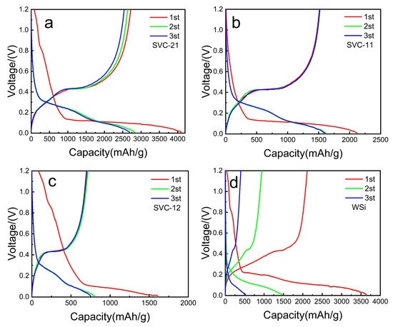 GCD curves at 0.1 A g−1 of SVC−21 (a), SVC−11 (b), SVC−12 (c), and WSi (d).