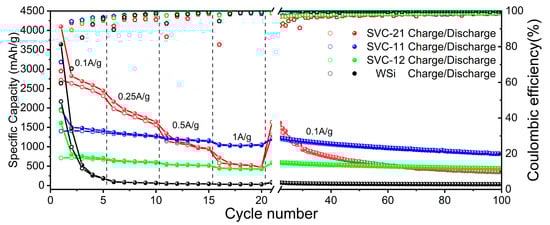 Figure 12 presents the results of the long–term cycling performance of Si@void@C and WSi electrodes at different current densities (0.1, 0.25, 0.5, and 1 A g−1). During the testing, the SVC−11 electrode outperforms all other samples, demonstrating superior cycle performance by maintaining a discharge capacity of 836 mAh g−1 even after 100 cycles. SVC−21 and SVC−12 show relatively poor cycle performance with a discharge capacity of 345 and 446 mAh g−1 after 100 cycles, respectively, but still much higher than that of WSi (33.75 mAh g−1). These results suggest that the amount of “dead lithium” can be effectively reduced; the electronic conductivity can be increased; and the volumetric expansion of silicon can be suppressed by forming the appropriate proportion of hollow layers and carbon layers. The enhanced cycling performance of Si@void@C is attributable to its robust yolk–carbon shell architecture, which provides a void space to accommodate the considerable volume changes of Si during continuous lithiation and de-lithiation. This structure facilitates electron transfer and sustains the integrity of the solid electrolyte interface.