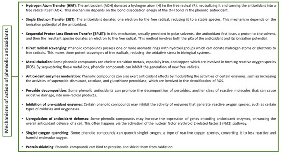 The differences observed between our results and the ones reported can be due to the differences in the extraction conditions and, in some cases, in the use of other standards while performing antioxidant activity studies [44]. High temperature mainly affects the extraction of compounds, causing them to decrease the solvent’s viscosity and increase its penetration into the matrix, as well as improve the extraction process of both polar and less-polar compounds, resulting in higher TEAC values [46]. Besides the temperature, the solvent type can affect the total antioxidant activity of polyphenols due to possible polymerization, depolymerization, and H-bonding of antioxidants between them and with solvent molecules such as water and methanol [47]. Finally, the antioxidant activity of phenolic compounds is also dependent on the reaction mechanism, solubility parameters, and electron transfer capability [47,48,49,50,51]. Figure 1 provides a brief overview of the general mechanisms of these antioxidants’ actions.