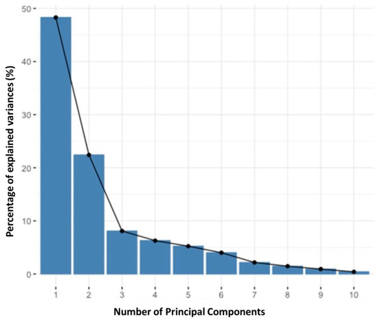 In Figure 2, the x-axis shows the principal components (dimensions), of which there are 10 in this case. The y-axis shows the percentage of the explained variance per principal component. The elbow appears to occur at the third principal component. The scree plot analysis illustrates that the first two principal components already represent a very reasonable percentage of the total variability (71%); therefore, only these two components were considered in the following analyses.