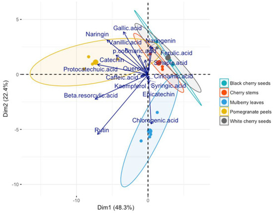 The biplot in Figure 3 shows the scatter plot of the first two principal components (they explain ±71% of the total variability) regarding the agricultural by-products. Arrows indicate the contribution of the polyphenols (variables) to each component.