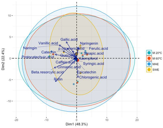 Figure 4 shows that the extraction technique does not affect the number of antioxidants because no cluster can be distinguished. Vladić et al. [24] compared SWE and MAE in the extraction of bioactive compounds from PPs. They used PCA to identify potential clusters regarding the various extraction techniques and categorized them based on their yield and phenolic content. These authors reported a negative correlation between MAE loadings and PC1. In contrast, a positive correlation was observed with PC2, and the cluster of MAE was related to TPC, TFC, ellagic acid, and punicalagin. In contrast, the loadings of the SWE extraction showed no significant correlation with PC1 and a slight negative correlation with PC2. The cluster of the SWE extraction was closely associated with gallic acid, punicalin, and the extraction yield. These authors also concluded that a temperature above 160 °C was not favorable for extracting phenolic compounds. Conversely to our results, these authors reported differences between the two extraction techniques.