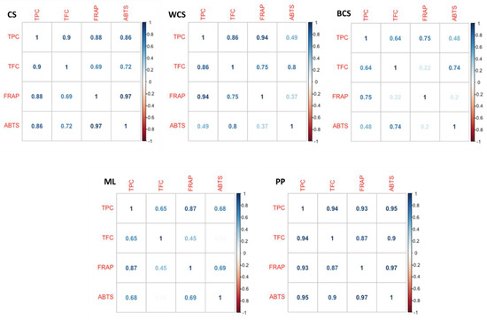 The highest correlation was observed for MLs between TPC and FRAP (R2 = 0.87). No correlation was observed between TFC and ABTS (R2 = 0.04).