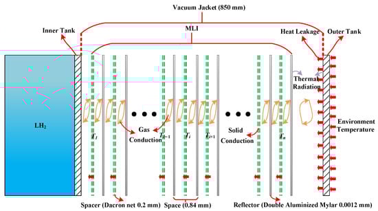 - Jiang, W.B.; Sun, P.J.; Li, P.; Zuo, Z.; Huang, Y. Transient thermal behavior of multi-layer insulation coupled with vapor cooled shield used for liquid hydrogen storage tank. Energy 2021, 231, 120859. [Google Scholar] [CrossRef]
