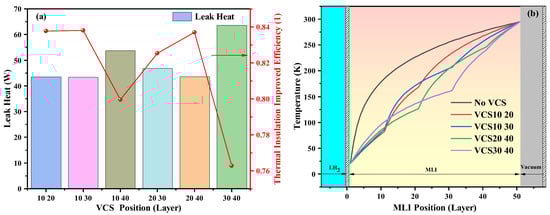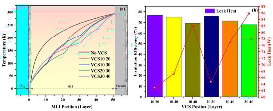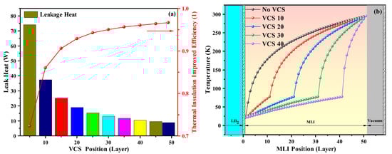 - The minimum heat leakage of P-VCSs can be improved by 76.6% compared with that of No VCS. The heat leakage through the MLI will further decrease when S-VCSs is used. The minimum heat leakage of S-VCSs is 83.79%, 25.67% and 30.75% that of No VCS, VCS10 and P-VCS, respectively. The maximum insulation efficiency can be improved by 7.16% and 43.26% compared with that of VCS10 and P-VCS, respectively;