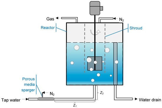 Figure 1 shows the schematic of a lab-scale system for degassing oxygen from water by nitrogen bubbles. The degasser can be switched between reactor types depending on operating conditions. It acts as a GIAT without nitrogen injection. Additionally, when nitrogen is fed into the system, the contactor works as either a CSTR with mechanical agitation or a BC without stirring. It can be operated continuously or batch-wise with respect to liquid phase under normal conditions, i.e., atmospheric pressure (101,325 Pa) and room temperature (293.15 K). Details about the system have been reported in our previous work [,]. Briefly, the degassing system consists of a 419.1 mm (i.e., Z = Z1 + Z2) long pipeline with inner diameter (ID) of 25.4 mm, a porous media bubble generator, and a square acrylic tank. The tank dimensions (height × length × width) are 457.2 mm × 406.4 mm × 406.4 mm. The liquid/gas inlet is in the geometric center of the cell bottom. Keeping the water level at 304.8 mm, the 4-bladed straight turbine impeller is submerged 241.3 mm below the liquid surface. Both the impeller diameter and vertical width are 101.6 mm. The concentration of DO is measured by a Hach DO meter (Model WU-53013-10 from Cole-Parmer). The mathematical models and CFD simulations are validated by experimental data obtained by Lei [].