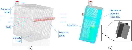 The 3D full geometry of BC and a quarter of GIAT and CSTR are considered as solution domains. The computational domains are subdivided into hexahedral structured grids, as shown in Figure 3. Zonal mesh refinement is carried out. The maximum surface grid size and cell length at the impeller are about 1.7 mm [,,]. The grids are enough for simulations compromising the accuracy and computational time. The horizontal pipe, gas distributor, and shroud are not modeled. The pressure-outlet boundary condition is set for the two outlets. The wall and the impellers in GIAT and CSTR employ no-slip conditions. Furthermore, the multiple reference frame (MRF) model [] is used for the rotation, considering its applicability in many studies [,,] and the long computation time needed. The rotational periodic boundary condition is adopted.