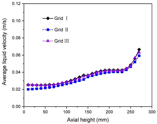Case G is used in this test for BC with three grid configurations. Hexahedral cells are generated and the grid at the inlet and liquid level is refined. The gas is mainly distributed in the center of the tank because of the inlet arrangement. Figure 4 shows the average axial distribution of liquid velocity along the tank height. The three configurations yield similar results. The mean bubble sizes predicted by PBM for the three grids from Grid I to III are 1.5, 1.6, and 1.6 mm, respectively. In addition, as reported by other researchers [,,], grid refinement does not always improve the simulation accuracy in BC. Therefore, Grid II is employed for the simulations of BC.