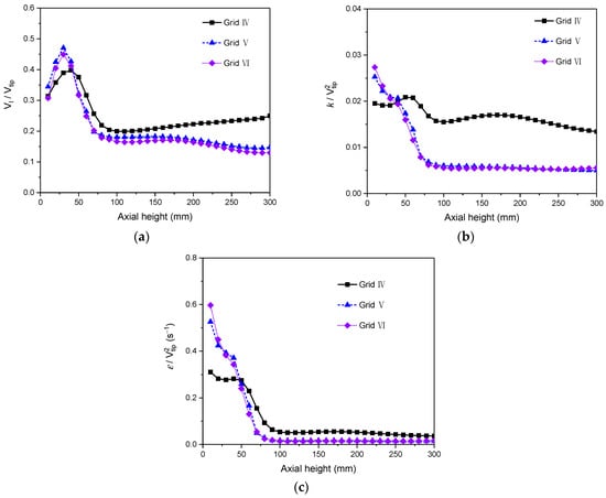 The average axial distribution of (a) liquid velocity, (b) turbulent kinetic energy, and (c) turbulent dissipation rate in Case E at a distance of 100 mm from the reactor center.