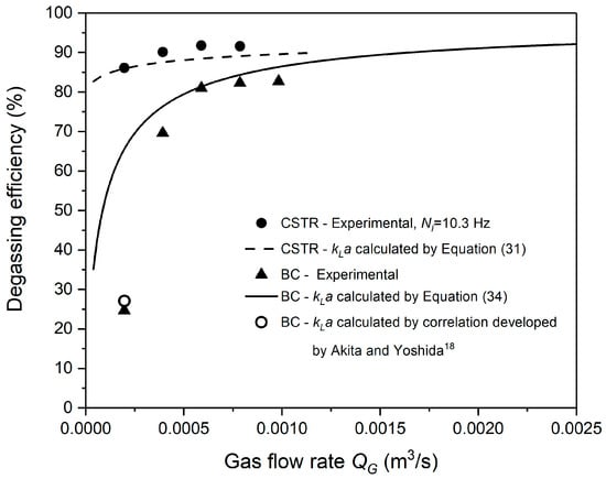 Figure 7 shows the effects of various flow rates of purge nitrogen on degassing efficiencies of different reactors. For the BC with a porous media sparger, the degassing efficiency increases from 24.7% to 69.4% when the nitrogen flow rate increases from 1.97 × 10−4 to 3.93 × 10−4 m3/s, and it steadily rises to 82% or so as the plateau. Furthermore, the CSTR stirring at 10.3 Hz leads to the highest efficiencies among the investigated reactors.