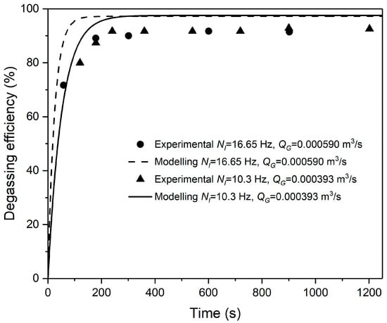 The deviations between experiment and mathematical models when agitation speed is above 10 Hz are within ±5%. However, it is not the case when the agitation speed is 8.5 Hz, which is because the correlation used to estimate the gas induction rate does not apply to speeds approaching . The reason for this mismatch is that, at the beginning of gas induction, the gas is induced in the regions of the impeller where the fluid density reduces sharply. In addition, the pressure driving force is much lower compared to that in the absence of gas. Thus, the calculation overestimates the gas intake, resulting in an overestimation of the associated degassing efficiency [].