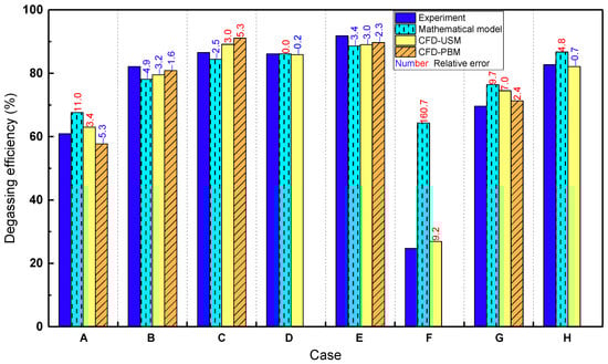 Furthermore, the mathematical models predict the variations of degassing efficiency with acceptable accuracy at a low cost. They are maybe preferred in practice because of the compromise between computational cost and accuracy. However, the mathematical models are restricted to specific operating conditions and reactor configurations due to the use of empirical correlations. Conversely, CFD models provide more accurate results at high computational cost. They can also reveal more local details inside reactors. For instance, the mathematical models cannot well interpret the low efficiency at relatively low gas flow rate for BC with porous media sparger in Case F; CFD results clearly show the relatively low values of and , resulting in inefficient mass transfer. The combination of these two kinds of models helps to understand the degassing system better, and guides its modification and optimization. Moreover, coupling CFD with optimization algorithms (e.g., multiobjective evolutionary algorithm []) to efficiently optimize reactor configuration for maximizing degassing efficiency can be explored in the future.