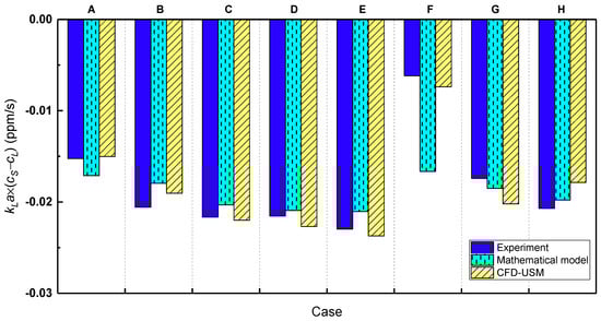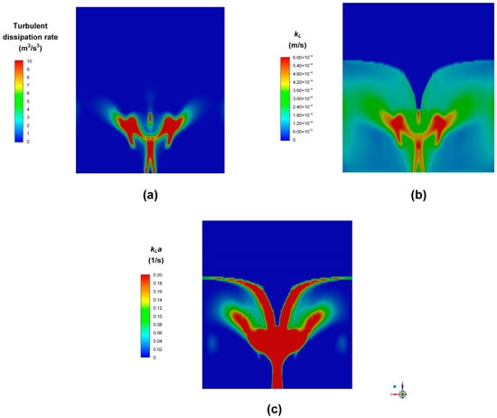 Besides, the contours of , , and in each case using CFD-USM simulation are shown in Figures S1–S3. The values calculated by mathematical models, i.e., , are highlighted in the labeled color bars for comparison. For , the predicted values of mathematical models fall within the ranges of CFD results. Overall, the variation in values predicted by the two mass transfer models is small in these reactors. The value almost depends on , which is consistent with previous findings []. For GIAT (see Figure S1), with the increase in agitation speed, increases as the gas induction rate increases. For CSTR (see Figure S2), the increasing gas flow rate also mainly leads to larger . For BC (see Figure S3), compared to Case F, not only , but also in Cases G and H is significantly increased. The effective gas-liquid mass transfer is achieved in GIAT and CSTR by impeller rotation []. The in these two degassers is predicted by the turbulent dissipation rate. Thus, is visibly bigger near the blades with higher turbulent dissipation rates (see Figure 13). However, in BC with porous media sparger, the location of gas inlet results in gas concentrating in the center of the tank (see Figure S3).