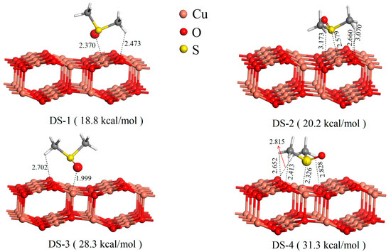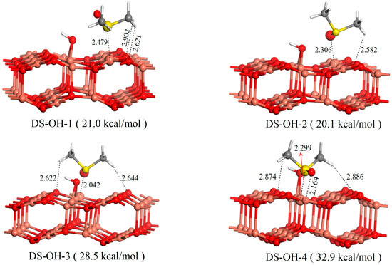 The adsorption of C2H6OS on the OH pre-adsorbed CuO(111) surface occurred on the Lewis acid sites via the O and S atoms in the molecule. This study focused primarily on the C2H6OS molecules in the vicinity of OH, essentially resulting in four types of adsorption. These include the adsorption of the S and O atoms in the molecule close to the Cusuf atoms, and those close to the Cusub atoms near the OH on the surface, as depicted in Figure 3. To facilitate the description, “DS-OH” is used to represent the stable adsorption structure of C2H6OS on the OH preadsorbed CuO(111) surface.