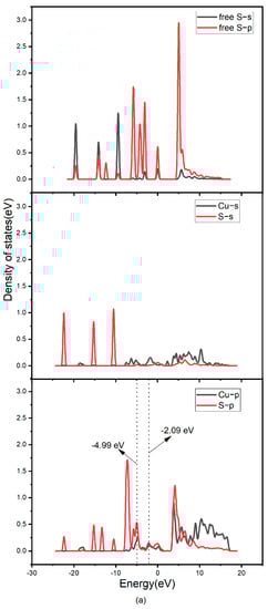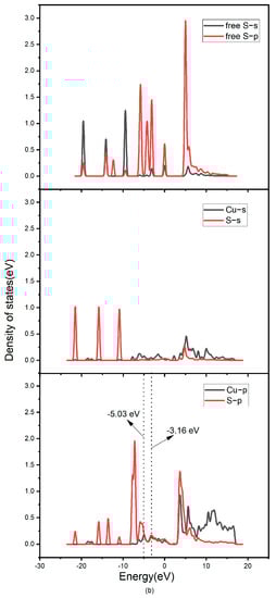 To further understand the interaction between C2H6OS and the pure or OH pre-adsorbed CuO(111) surface, the electronic structures of the most stable adsorption configurations, DS-4 and DS-OH-4, were analyzed. The partial densities of states (PDOS) of these configurations before and after C2H6OS adsorption are shown in Figure 4. Evidently, both the s-PDOS and p-PDOS of S in C2H6OS exhibited a leftward shift, with the p-PDOS of S moving to a lower energy compared with the initial configuration. Moreover, after adsorption, the S p-PDOS interacted with the Cu p-PDOS at −2.09 and −4.99 eV on the pure CuO(111) surface, thus implying the presence of strong interactions between C2H6OS and the pure CuO(111) surface. In the case of OH preadsorbed CuO(111) surface, the S p-PDOS interacted with the Cu p-PDOS by state overlap at −3.16 and −5.03 eV, as shown in Figure 4b. These energies correspond to the S–Cu bonds in DS-OH-4. The characteristic peaks of the p orbitals near the Fermi level became wider after adsorption, thus indicating a significant delocalization of the p orbitals of the S atom in C2H6OS.
