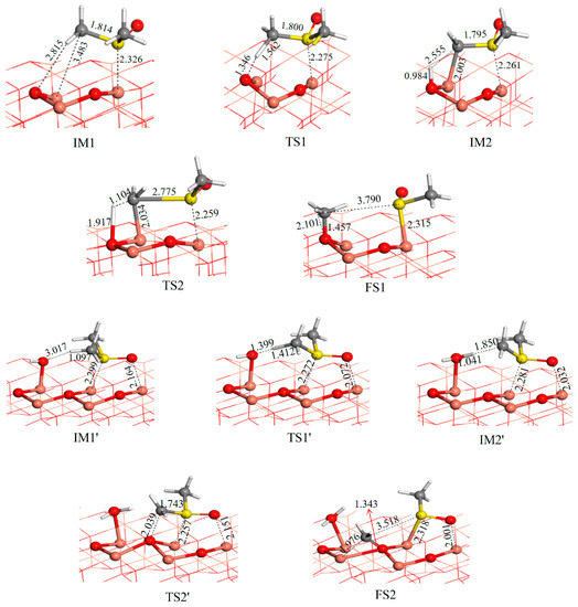 The intermediate C2H5OS (IM2 in Figure 5) underwent further C–H and C–S bond cleavage on the pure CuO(111) surface. Various possibilities for C–H and C–S bond cleavage were considered; however, no stable configuration with C–H bond cleavage was identified. Instead, two dissociative structures resulting from the C–S bond cleavage were observed. These structures involve the -CH2 group attacking either the Osuf of the surface OH or the Cusub atom near the OH, and thereby resulting in C–S bond cleavage (Figure S2). The Gibbs free energy changes at room temperature for these two processes were calculated and are listed in Table 2. The results reveal that the transfer of -CH2 to the Osuf site represents a thermodynamically stable reaction with a −11.4 kcal/mol change in Gibbs free energy. By contrast, if -CH2 is transferred to the Cusub site, then 26.4 kcal/mol energy must be overcome for the reaction to occur. Furthermore, the energy barriers for both processes were calculated and revealed that if -CH2 is transferred to the Osuf site, then 38.1 kcal/mol through the transition state TS2 must be overcome, as shown in Figure 6; this value is much lower than that reported (66 kcal/mol) [31,32] for a typical C−S bond breakage. Finally, if -CH2 is instead transferred to the Cusub site, then 50.0 kcal/mol must be overcome, indicating that the transfer of -CH2 from the IM2 intermediate state toward the Osuf site represents both a thermodynamically and kinetically favorable reaction path.