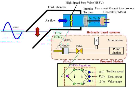 Figure 4 shows the configuration of the proposed algorithm, which can compensate for the time delay based on a deep learning algorithm. The proposed algorithm performs predictive control to compensate for the mechanical operation delay time of the valve-driven actuator to implement the rated control. Time delay compensation predicts the valve motion control signal using a deep learning algorithm. The mechanical operation delay is compensated for by estimating the valve angle, in advance, by the delay time. Through this, it is possible to obtain an increase in the operation rate and increase the power generation of the vibration-column-type wave power generator.