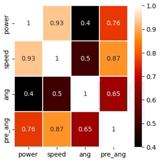 Figure 6 shows the correlation of the input data to configure the rating control based on the deep learning algorithm. The correlation matrix confirmed the predictive performance of the data. Thus, it is possible to select the input data that affect the estimation data. The numbers and colors shown in Figure 6 indicate the degree of correlation. The closer the number is to 1, the closer the color is to white and the higher the degree of correlation. The input is the amount of electricity generation (power), the angular velocity (speed), and the current valve angle (ang), and the output is the valve control angle after 2 s (pre_ang).