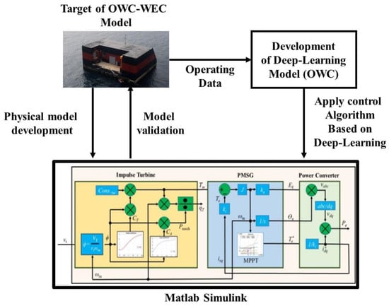 In order to overcome the challenges posed by wave variability, several studies have proposed the use of artificial intelligence (AI)-based deep learning techniques in renewable energy applications [22,23,24,25,26]. Asrari et al. [22] proposed a method for predicting the hourly sunshine state for photovoltaic power generation; Mendonça de Paiva et al. [23] conducted a study on the improvement of wind speed estimation performance for wind turbine systems; and Roh [27] conducted a study on large-scale wind turbine control. Ju et al. [28] investigated an operation control algorithm to predict the generation output of renewable energy and increase the economic feasibility. In conclusion, as artificial-intelligence-based estimation techniques are being introduced in various renewable energy fields, estimation control algorithms based on artificial intelligence technology are expected to be able to control the variability of wave energy more precisely. However, despite the extreme variability in wave power generation, AI-based control applications are found lacking [20]. Roh and Kim [20] analyzed the angular velocity estimation performance of the wave power generator according to a deep learning algorithm; however, they did not evaluate the applicability of the actual control system. There may be a limit to accurately determining the operating characteristics of an actual system. That is, it is necessary to develop a control algorithm capable of confirming the dynamic characteristics of the actual system under the input conditions of the wave power generator and to verify its performance.