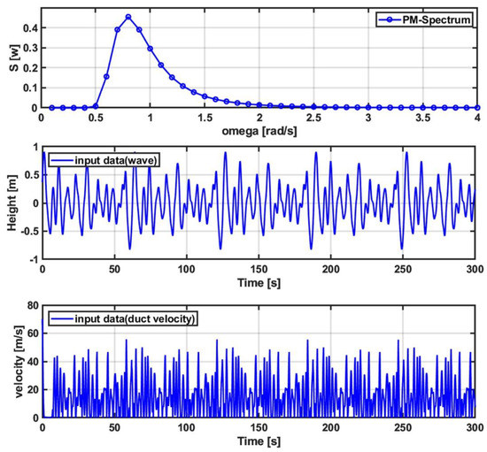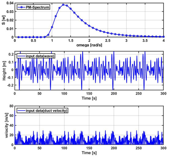 Figure 10 shows the irregular wave input data for the performance verification of the rated controller. The spectra of the irregular wave energy (wave spectrum density, S[ω]), the input time series, and the duct flow velocity are shown in Figure 10. The performance of each rated controller was verified under the same input conditions. Because the rated controller operates at more than the rated energy, the wave energy conditions in this part were selected as wave conditions (Hs = 2.0 m, Tp = 8.0 s) that could satisfy the rated conditions of the vibrating-column wave power generator.