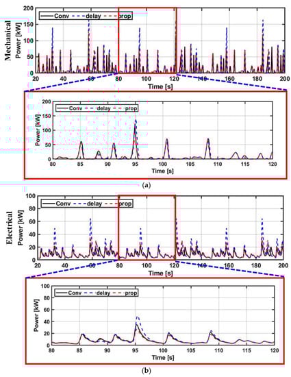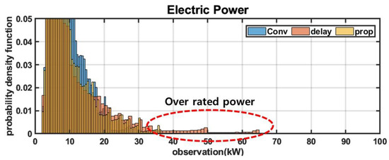 Figure 11 shows the mechanical and electrical powers of the OWC-WEC according to each rated controller. There are a total of three controllers compared in this paper: an ideal rated controller (Conv, black), a rated controller with a physical time delay similar to that in the actual system (delay, blue), and a proposed rated controller based on a deep learning model (prop, red). Because the existing rating controller performs rated power control without a time delay, both the mechanical and electrical power are stable, and the electrical power does not exceed the rated power. The rated power controller reflecting the physical time delay exhibits higher mechanical power and electrical power than the ideal rated controller because a time delay occurs. In particular, as the electrical power exceeds the rated power, this results in a reduction in the system stability and operating efficiency owing to mechanical and electrical fatigue. In conclusion, the wave condition under which the OWC-WEC can generate power is reduced. However, because the proposed method predicts the valve control angle for rated power control in advance by the time delay, it shows almost the same performance as the existing method, even though a physical time delay occurs. In other words, it can be confirmed that the mechanical and electrical powers were stable, and the electrical power did not exceed the rated power. Figure 12 shows a histogram of the electrical power for each rated controller. Only the rated controller reflecting the time delay exhibited power exceeding the rated power.