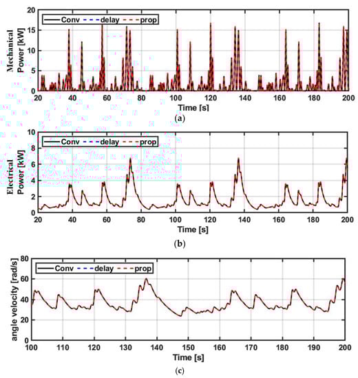 Figure 18 shows the mechanical power, electrical power, and angular velocity of the turbine of the OWC-WEC according to each rated controller. It can be confirmed that all the output results appear the same because at operating conditions below the rating the rated controller does not operate.