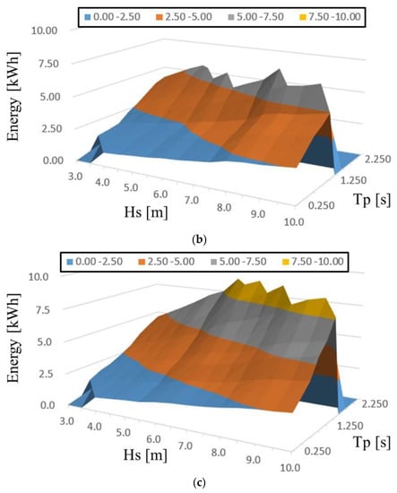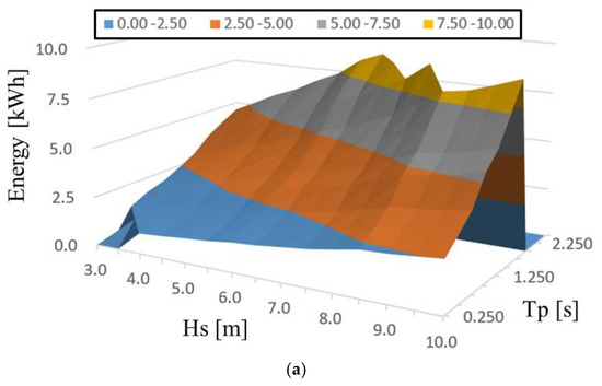 Figure 20 shows the output energy of each controller according to the input energy change. For the wave conditions (Hs, Tp) shown in Figure 20, a comparative analysis of the output energy was performed based on conditions that may occur in the sea area where the target wave power generator is installed (Figure 8). The part represented as zero in the average power generation data is a wave condition in which continuous power generation is difficult because it exceeds the rated power. Because the ideal rated controller (Figure 20a) and the proposed controller (Figure 20c) are not affected by the time delay, generation is possible over a wider range of wave conditions. However, the rating controller (Figure 20b) that reflects the time delay of the actual system confirms that wave conditions that can generate power exceeding the continuous rated power result in a decrease in overall power generation. In conclusion, the proposed rating controller can generate power over a wider range of wave conditions because it can control a rating similar to the existing ideal rating controller, even though a physical time delay occurs on the actual system. Thus, the proposed rating controller can increase the annual power generation of OWC-WECs. Table 1 shows the annual power generation for each controller. It can be seen that the controller with time delay reduces power generation by about 31% compared to the ideal conventional controller, but the proposed algorithm only reduces it by about 0.4%.