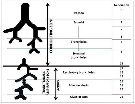 - Weibel, E.R. Geometric and Dimensional Airway Models of Conductive, Transitory and Respiratory Zones of the Human Lung. In Morphometry of the Human Lung; Weibel, E.R., Ed.; Springer: Berlin/Heidelberg, Germany, 1963; pp. 136–142. [Google Scholar] [CrossRef]