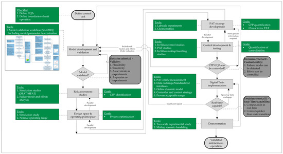 - Zobel-Roos, S.; Schmidt, A.; Mestmäcker, F.; Mouellef, M.; Huter, M.; Uhlenbrock, L.; Kornecki, M.; Lohmann, L.; Ditz, R.; Strube, J. Accelerating Biologics Manufacturing by Modeling or: Is Approval under the QbD and PAT Approaches Demanded by Authorities Acceptable without a Digital-Twin? Processes 2019, 7, 94. [Google Scholar] [CrossRef]