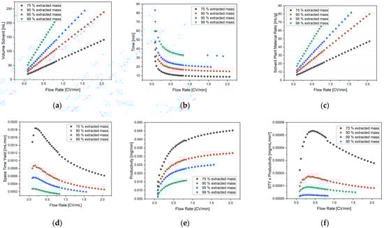Derivation of key process figures, solvent consumption (a), extraction time (b), ratio of plant material to solvent (c), space-time-yield (d), productivity (e) and combination of space-time-yield and productivity (f) as function of flow rate.