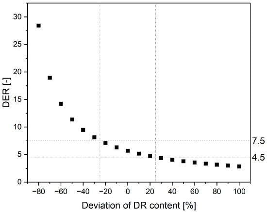 For the current example, the following was considered with respect to the DER. For extraction, a DER of 5.7 was obtained for the selected extraction conditions. For a variation of ±25% of the DR content of the plant material, bands for the DER were set from 4.5 to 7.5 as shown in Figure 4. For a plant material with a higher dry content distribution of ±50%, DER bands of 3.7 to 11.3 would result. Due to the reciprocal character of the DER, a higher dry residue content in the plant material caused a smaller absolute deviation in the DER than the “deterioration” of the plant material quality.