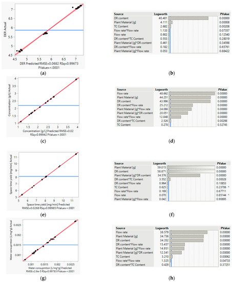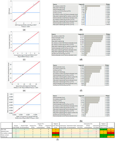 Display of the risk assessment for fixed solvent–drug ratio with the quality of regression and parameter sensitivity for the key process figures. DER (a,b), concentration of extract (c,d), space–time yield (e,f), water consumption (g,h) and summary (i). * Severity score refers to combination the main impact and interaction of process parameter.