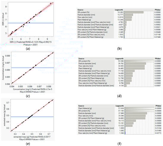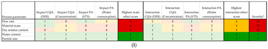 Display of the risk assessment for fixed solvent–drug ratio with the quality of regression and parameter sensitivity for the key process figures. DER (a,b), concentration of extract (c,d), extracted mass (e,f), space–time yield (g,h) and summary (i). * Severity score refers to combination the main impact and interaction of process parameter.