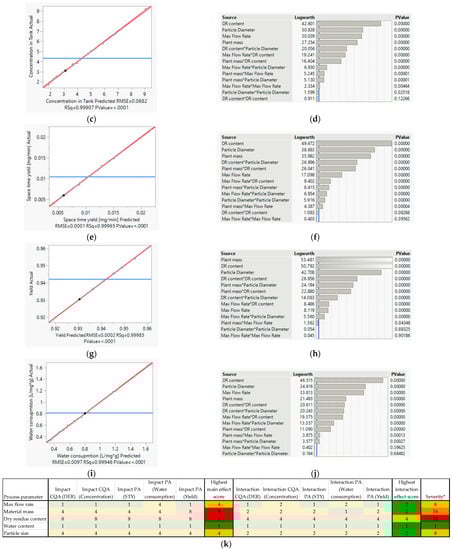 Display of the risk assessment for PID-controlled flow rate with the quality of regression and parameter sensitivity for the key process figures. DER (a,b), concentration of extract (c,d), space–time yield (e,f), yield (g,h), water consumption (i,j) and summary (k). * Severity score refers to combination the main impact and interaction of process parameter.