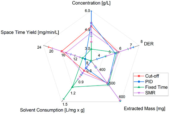 The quantitative comparison of the control strategies is shown in Figure 10. Again, the cutoff and PID strategies showed similar patterns for the reasons shown. However, it can be seen that the cutoff strategy showed more desirable values in all of the categories. Since the process was run to completion with a full volume flow, the space–time yield increased. The most inefficient control strategy was the fixed-time strategy, with the lowest space–time yield and the highest solvent consumption. This was due to the lack of ability to influence the existing process variables. The highest space–time yield and therefore the lowest COGs were achieved through the in-line cutoff strategy.