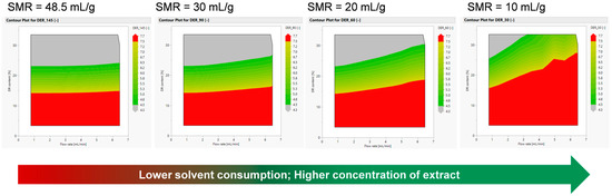 Using this, the digital twin can accurately predict the course of extraction and can intervene in the process. First, the digital twin simulates the expected quality of the extract. If this does not meet the desired criteria, especially the DER, the volume flow can be adjusted. As shown in Figure 11, a lower volume flow rate can thus lead to more acceptable results from a regulatory point of view in respect to the DER even with a plant material of poorer quality, e.g., a lower dry residue content. The basis for this is shown in Figure 11; in these contour plots, the volume flow rate is varied on the X-axis, and the dry residue content is varied on the Y-axis. Thus, for a fixed SMR, the extract reached a different DER. In the figure, the regulatory defined areas are colored green. At a high SMR, the volume flow rate and dry residue content were not sensitive to the DER of the extract. On the other hand, at a lower SMR, if the dry residue content deviated negatively, a sufficiently good extract could only be achieved with a lower volume flow.