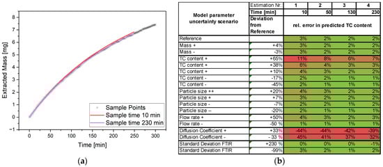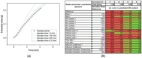 For the determination of the dry residue content, model parameters according to [15,16] were determined before the operation with the digital twin. In addition, the mass and particle size of the plant material had to be recorded. With these data, the course of the volume flow and the cumulative curve of the extraction process, the dry residue content of the plant material was determined. Figure 12a shows the exemplary estimation, and Figure 12b shows the evaluation of its quality with green color showing good fit. Here, a good estimate of the dry residue content could be given after 4 min of extraction time. This was performed for variations in the model, operating and process parameters. As expected, the accuracy of the estimate increased with a longer sampling time. A significant degradation of the quality of the estimate happened only due to inaccuracies in the recording of the particle size. However, a technical solution to ensure the measurement accuracy of the particle size is very cost-effective and ready-to-use [46,47].