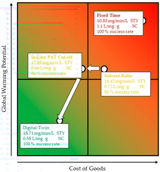 Parameter estimation took 5 min on average but could be shortened to 2.5 min. Thus, a new optimized extraction strategy could be applied after 6.5 min. As demonstrated in Figure 14, after approximately 7 min, the volume flow was ramped down to continue to meet the bands of the DER at a regulatory SMR. If the process were to continue at a constant flow rate, this extract would have to be discarded. In the simulation studies, there was a 14% error rate when running at the SMR, and there was a 100% success rate when implementing the digital twin. The digital twin did slow down production and reduce the space–time yield; however, the higher success rate resulted in higher overall efficiency. More of the plant material could be used, reducing waste. This should be particularly reflected in the GWP balance since each discarded batch included not only the GWP of the process with solvent use but also of the entire value chain beforehand. This started with plant breeding or wild collection and also included GWP-intensive drying, which can make up 90% of the GWP of a botanical product [20,51].