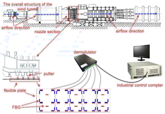 The wind tunnel is an important piece of experimental equipment used for aerodynamic research. It is also the key experimental equipment for research on the aerodynamic layout of the aircraft. Several studies on the wind tunnel construction were carried out several decades previously [,,,]. For a long time, wind tunnels have provided the basis for aerodynamic experiments in various fields (Wind Tunnel Application) [,,,,,]. The flexible plate is the core component of the wind tunnel. It is the key to producing a stable flow field. Flexible plates are subjected to complex loads during the operation of the wind tunnel. Therefore, the health status of the flexible plate needs to be monitored in real time. The stress field is an important physical quantity that reflects the health status of the flexible plate. The flexible plate stress field requires multi-point measurements. Fiber Bragg gratings (FBG) are fiber optic sensors that are sensitive to stress and temperature. In this paper, the FBG sensor is used to measure the local strain of the flexible plate. The measurement system composed of multiple sensors will have measurement errors caused by the failure of individual sensors during operation.