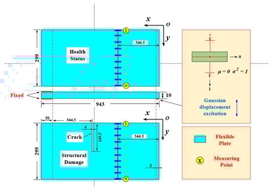 Based on the results of the simulation calculation of the flexible plate, the data of each measured point in the healthy state are extracted, and the mean (μ0) and standard deviation (σ0) are calculated. The mean and standard deviation of each measured point data under the condition of flexible plate damage are: μ1, σ1. The authors substituted the mean μ0 and standard deviation σ0 of each measured point in the healthy state into Equation (24) to generate 2000 groups of simulated acceleration data as health data. The acceleration data of each test point after the flexible plate structure damage comprise 2000 groups. The first 1000 groups are generated with the mean and standard deviation in the healthy state, and the last 1000 groups are calculated with the mean μ1 and standard deviation σ* of each test point data in the structure damage state. To verify the effectiveness of this method in the case of sensor damage, the authors used the above methods to generate health and damage data. The mean and standard deviation used in the last 1000 sets of damage data are: μ1, σ#.