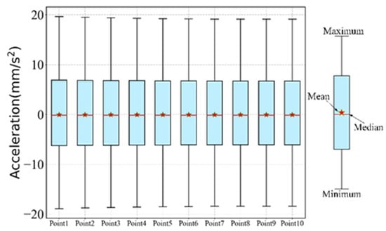 In this paper, the local acceleration information of the flexible plate is collected by simulation method. The details of the experiment are shown in Figure 2. As shown in the figure, one end of the flexible plate is fixed, and the impact load is loaded at the other end. The grid of the flexible plate is independently selected by the software. In this paper, acceleration measurement points are set locally on the flexible plate. The dynamic loads are then loaded onto the flexible plate. In this paper, local acceleration dynamic data of the flexible plate are collected under the healthy condition. Statistical regularity of acceleration data at each measurement point under structural health state is shown in Figure 3. The same experimental procedure was performed after the flexible plate structure was damaged. The statistical rule of acceleration data for each measured point under structural damage is shown in Figure 4.